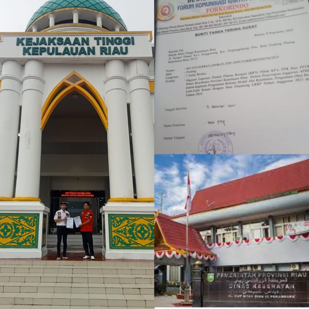 Dugaan praktik penyalahgunaan anggaran di lingkungan Dinas Kesehatan Provinsi Kepulauan Riau (Kepri) kini resmi dilaporkan ke Kejaksaan Tinggi Kepri oleh Lembaga Swadaya Masyarakat Forum Komunikasi Rakyat Indonesia (Forkorindo).