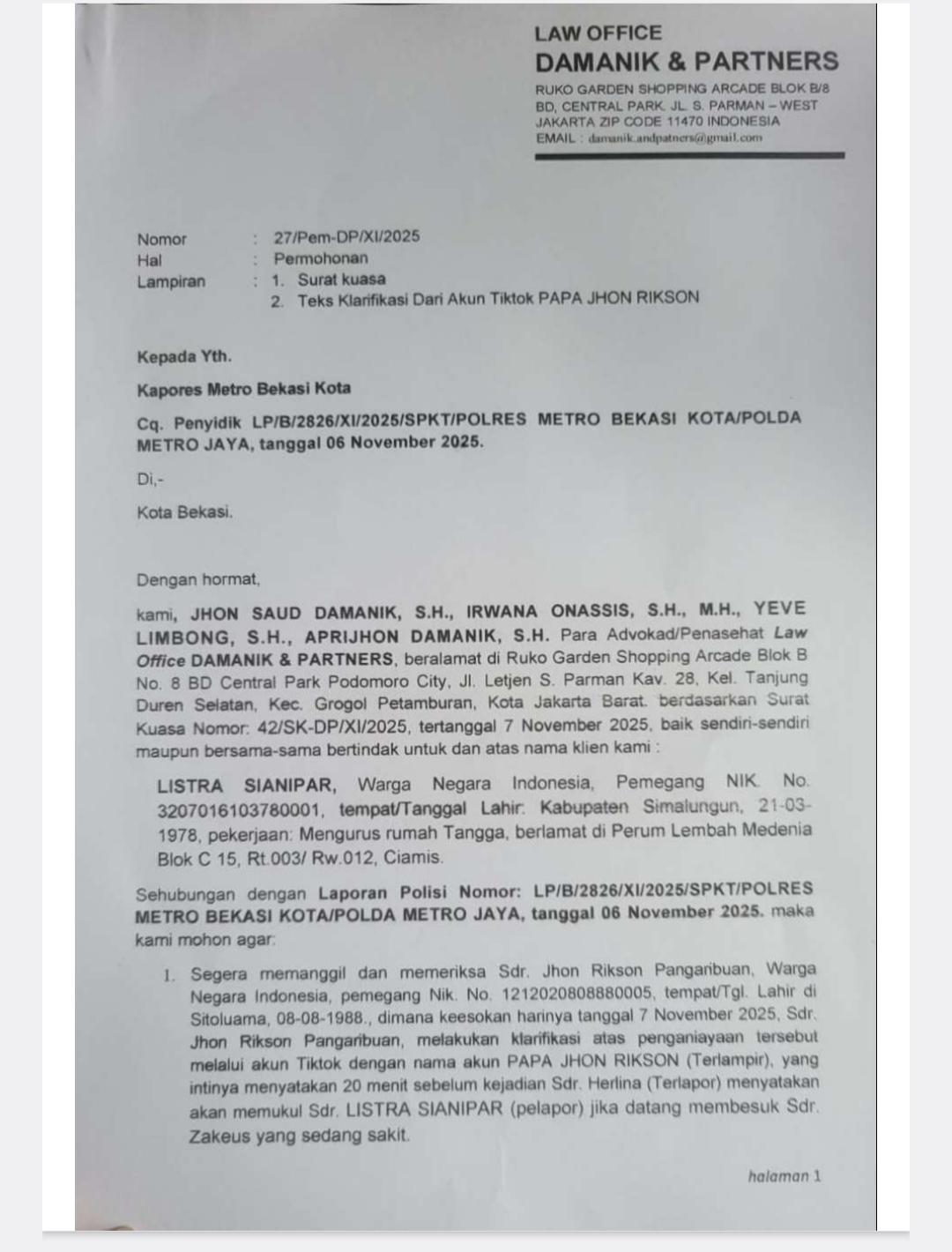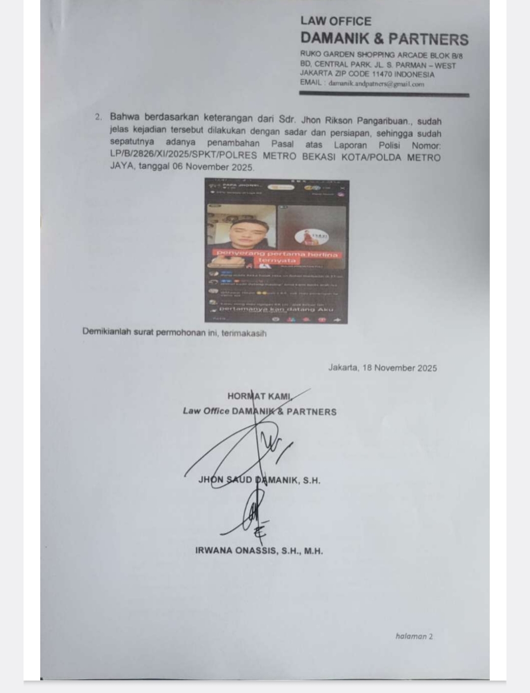 Kota Bekasi — Perkembangan terbaru muncul dalam penanganan perkara LP/B/2826/XI/2025/SPKT/Polres Metro Bekasi Kota, setelah kuasa hukum pelapor dari Law Office Damanik & Partners mengajukan permohonan tambahan pasal berdasarkan temuan baru dan keterangan terlapor.
