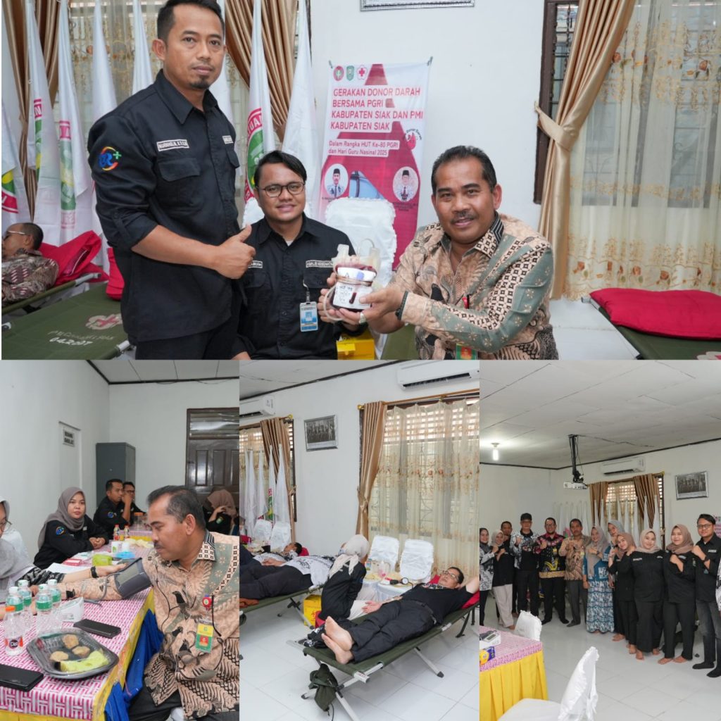 SIAK — NN News, Dalam rangka memperingati HUT PGRI ke-80 dan Hari Guru Nasional 2025, Persatuan Guru Republik Indonesia (PGRI) Kabupaten Siak menggelar kegiatan donor darah yang diikuti para guru dari berbagai kecamatan. Sebanyak 43 guru hadir dan 36 kantong darah berhasil dikumpulkan dalam kegiatan sosial tersebut.