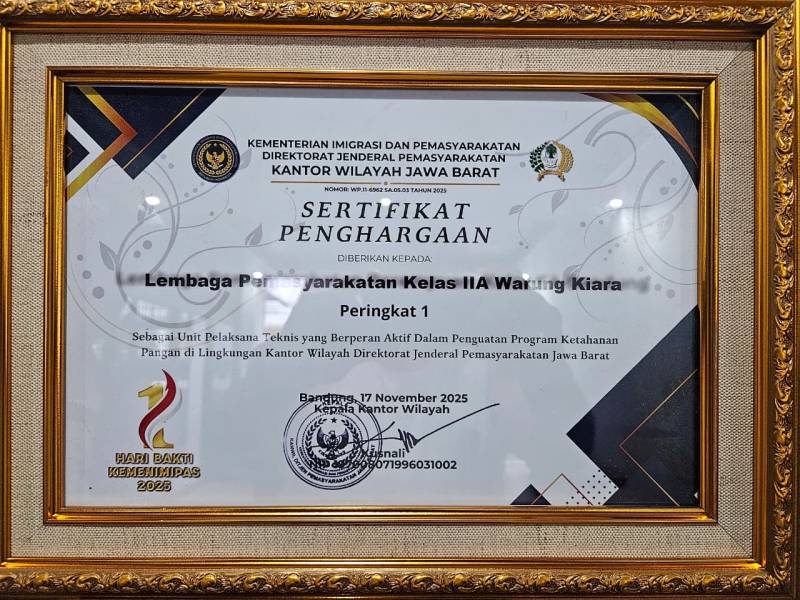 BANDUNG — NN NEWS, Kepala Lembaga Pemasyarakatan Kelas IIA Warungkiara Kurnia Panji Pamekas menerima penghargaan Predikat 1 dari Kepala Kantor Wilayah Direktorat Jenderal Pemasyarakatan Jawa Barat atas peran aktif dalam penguatan ketahanan pangan di lembaga pemasyarakatan.