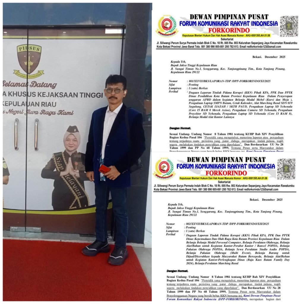 Langkah tegas diambil DPP LSM Forkorindo setelah resmi melaporkan dua dinas di Kota Batam ke Kejaksaan Tinggi Kepulauan Riau (Kejati Kepri) terkait dugaan tindak pidana korupsi pada penyerapan anggaran tahun 2022 hingga 2024. Laporan tersebut disusun berdasarkan data e-purchasing atau e-katalog, yang dianggap menunjukkan kejanggalan serius dalam pengadaan barang dan jasa.
